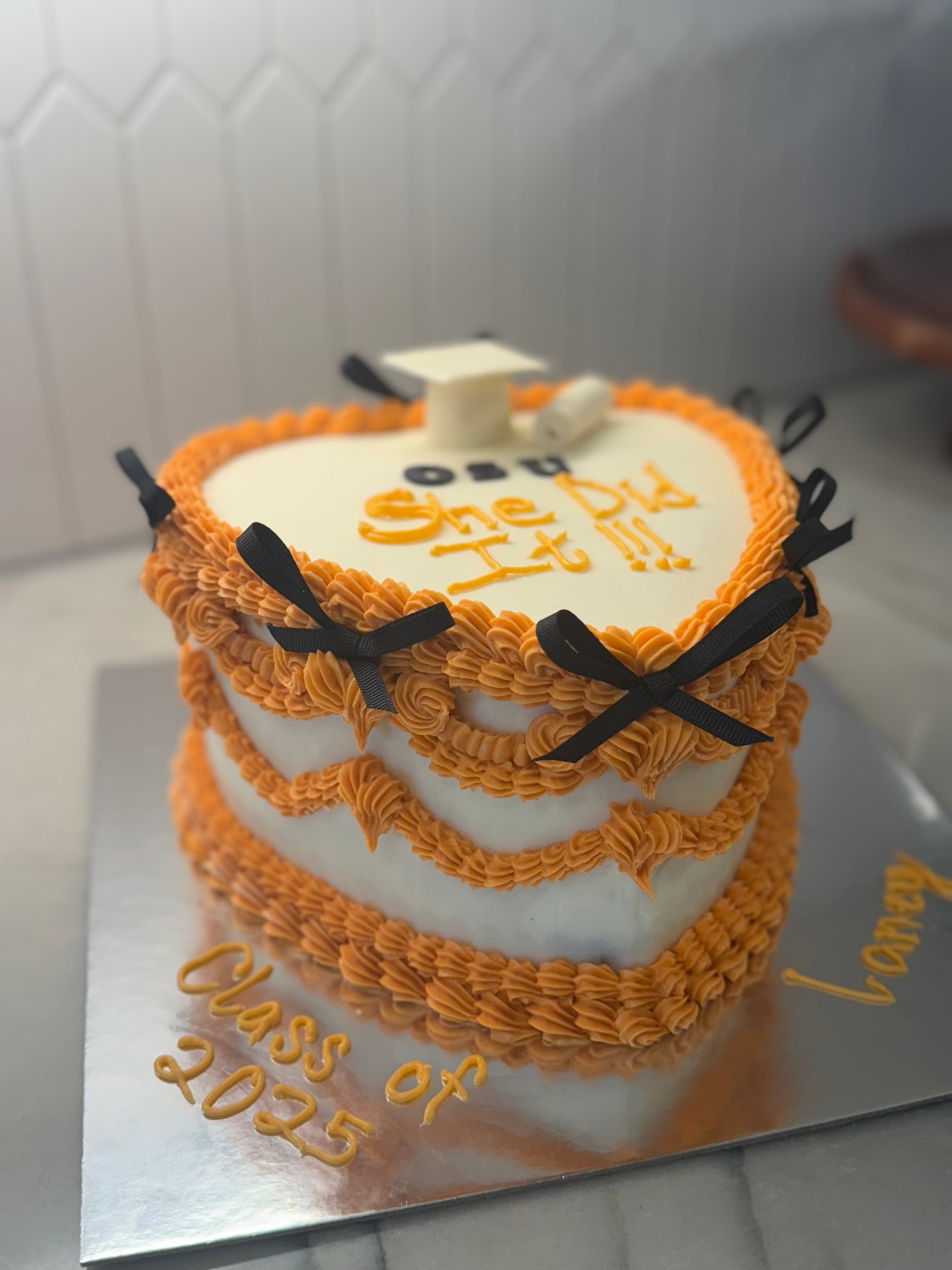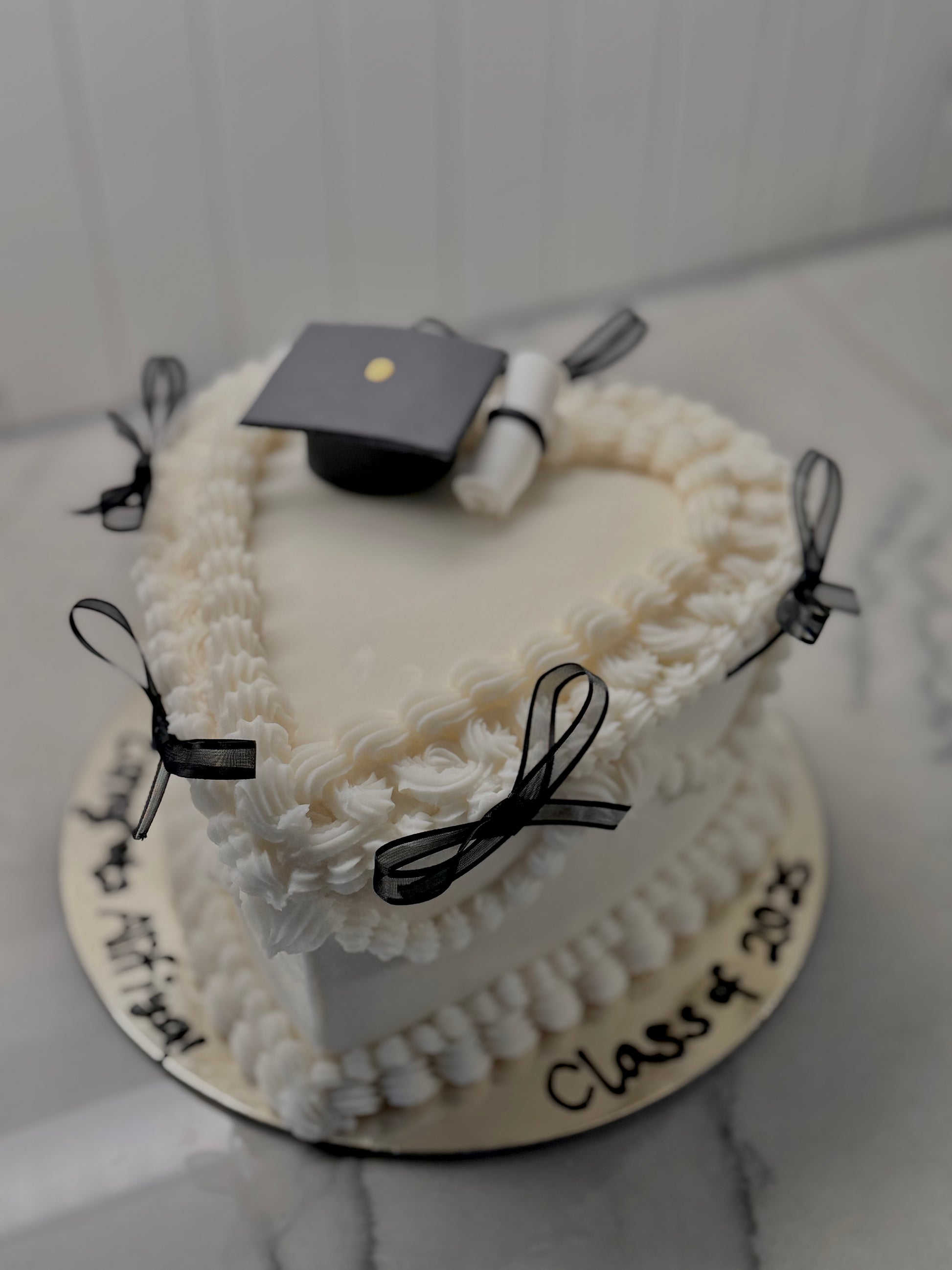 Celebrate your graduate’s big moment with this elegant heart-shaped cake, topped with a handcrafted fondant graduation cap and rolled diploma. Decorated with sleek black bows and personalized details, this cake combines classic charm with a modern touch—perfect for making their accomplishment feel extra sweet.